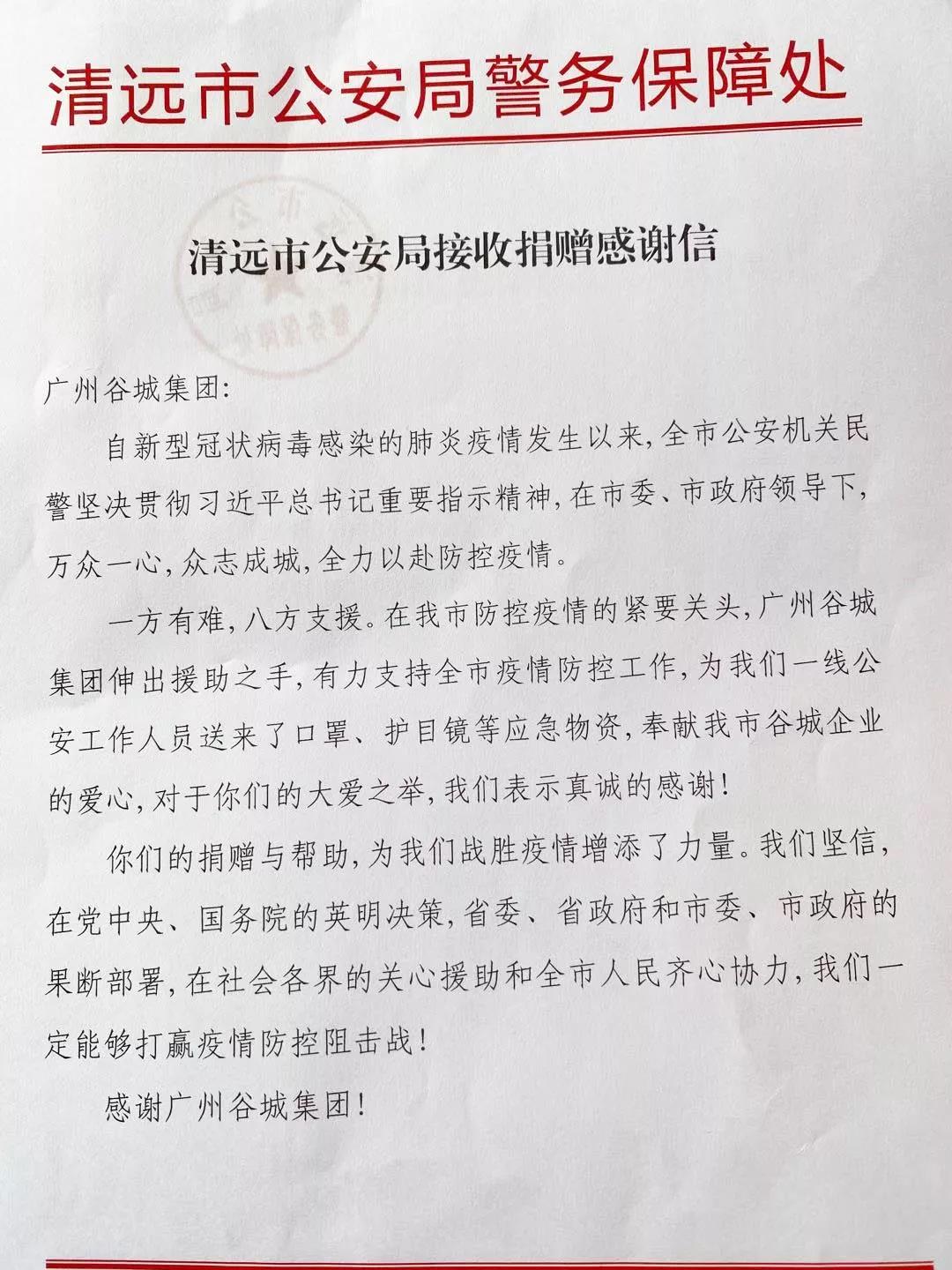 谷城集團(tuán)向清遠(yuǎn)市公安局捐贈(zèng)口罩10000個(gè)、護(hù)目鏡200副。清遠(yuǎn)市副市長(zhǎng)兼局長(zhǎng)畢洪波參加了捐贈(zèng)儀式,并感謝谷城集團(tuán)的愛(ài)心善舉。他說(shuō),谷城集團(tuán)為清遠(yuǎn)市的經(jīng)濟(jì)建設(shè)作出重要貢獻(xiàn)的同時(shí),積極履行企業(yè)社會(huì)責(zé)任,這次急疫情之所急,捐贈(zèng)防疫物資就是最好體現(xiàn)。