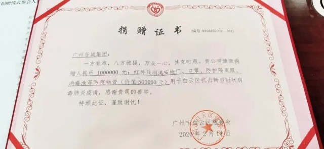 谷城集團向白云區(qū)政府捐贈現(xiàn)金100萬元、防疫物資紅外線測溫安檢門、口罩、防護一次性隔離服、消毒液等防控等價值50萬元物資