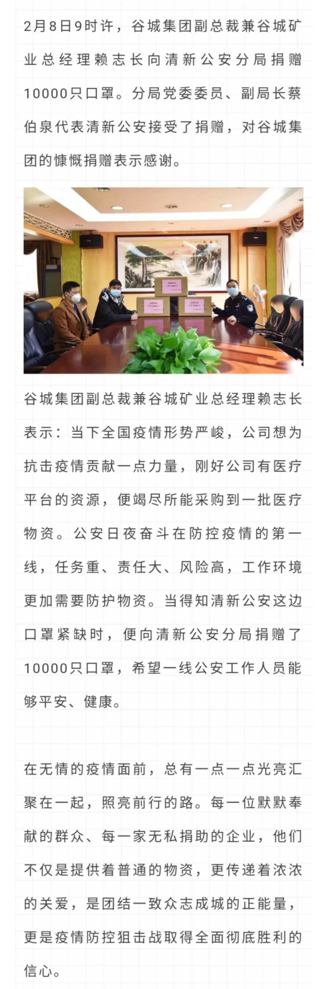 為堅(jiān)決打贏疫情防控阻擊戰(zhàn),清新公安全警動員,全力以赴投入疫情防控工作中,每天24小時輪班執(zhí)勤,守護(hù)全區(qū)人民群眾。疫情無情,人間有情。在清新公安奮戰(zhàn)在抗擊疫情一線時,谷城集團(tuán)副總裁兼谷城礦業(yè)總經(jīng)理賴志長表示:“支持防疫,企業(yè)責(zé)無旁貸?!?/span>