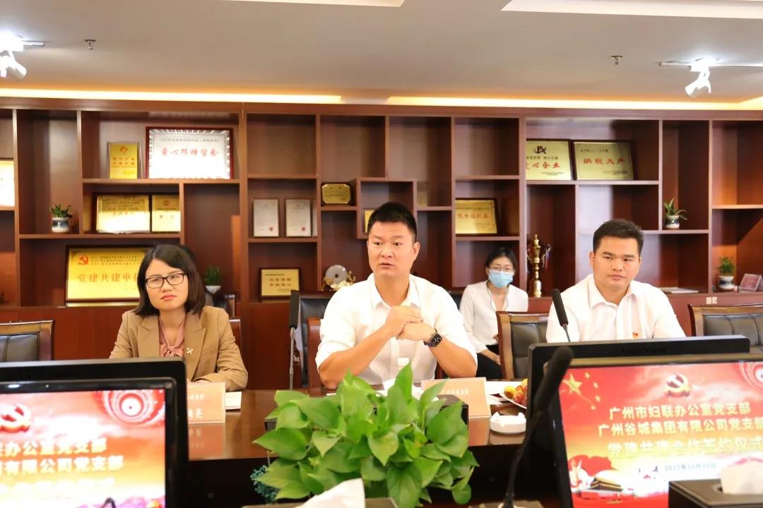 11月10日上午,廣州市婦聯(lián)辦公室黨支部與廣州谷城集團(tuán)有限公司黨支部在白云區(qū)東泰商務(wù)中心八樓谷城集團(tuán)會(huì)議室舉行黨建共建簽約儀式。廣州市婦聯(lián)黨組成員、副主席傅蝶,廣州市婦聯(lián)辦公室主任宋春梅,廣州市婦聯(lián)辦公室副主任李金泉,廣州市婦聯(lián)辦公室副主任萬娟,廣州谷城集團(tuán)副總裁賴志興,廣州谷城集團(tuán)黨支部書記、堅(jiān)基公司總經(jīng)理黃海亮,黨支部副書記、辦公室副主任羅梅英等參加黨建共建簽約儀式。