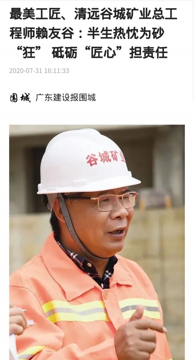 廣東建設報報道了《最美工匠、清遠谷城礦業(yè)總工程師賴友谷:半生熱忱為砂“狂” 砥礪“匠心”擔責任》一文,高度夸贊了谷城集團董事長、總工程師賴友谷在機制砂行業(yè)做出的貢獻。