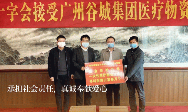 谷城集團(tuán)向清遠(yuǎn)市清城區(qū)紅十字會(huì)捐贈(zèng)現(xiàn)金10萬、一次性防護(hù)服1000套、防疫口罩30000個(gè),專門用于新型冠狀病毒肺炎防治工作。