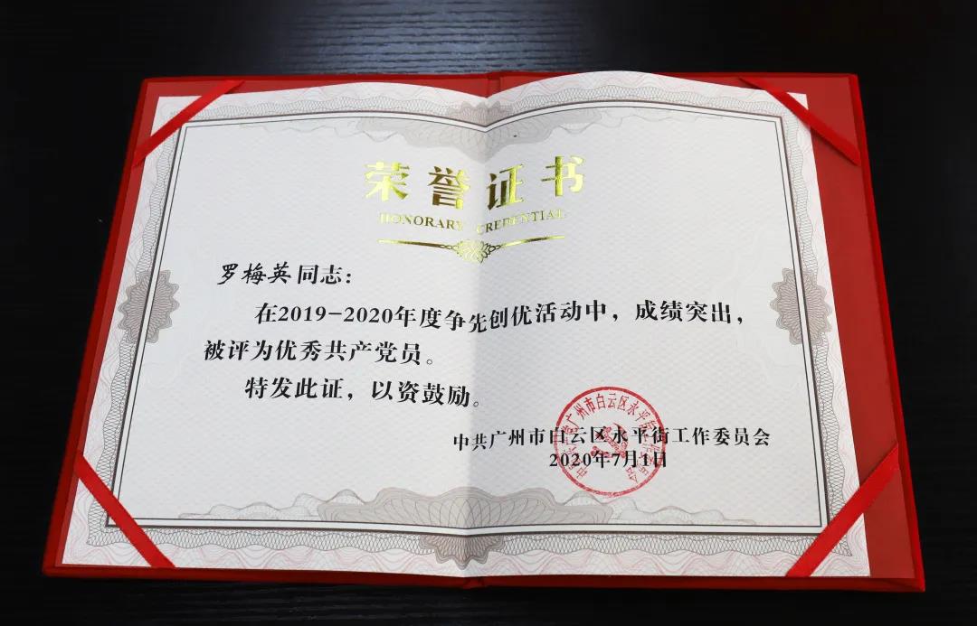 中共廣州市白云區(qū)永平街工作委員會(huì)表彰先進(jìn),中共谷城集團(tuán)黨支部副書(shū)記羅梅英同志被評(píng)為“優(yōu)秀共產(chǎn)黨員”的稱(chēng)號(hào)。