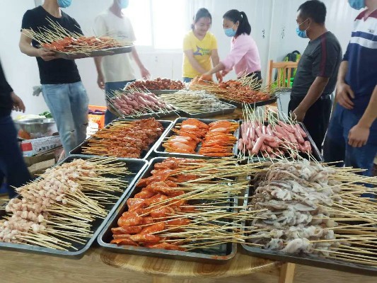 當晚霞退去,華燈初放的傍晚來臨,白天的活動和會議落下帷幕,美食狂歡開始了,幾十臺燒烤爐在宿舍前的廣場上一字排開,一陣陣濃濃的香味飄在夜空,工友們穿梭來往,挑選著自己喜愛的食材,或三個一群,或五個一堆,吃著自己親自動手的燒烤,喝著清涼的啤酒飲料,談論著一天的感受和對未來的憧憬。