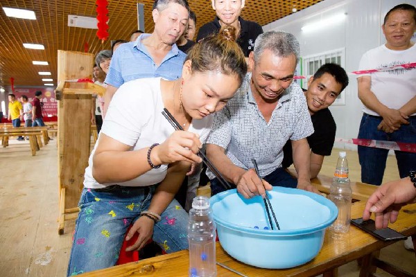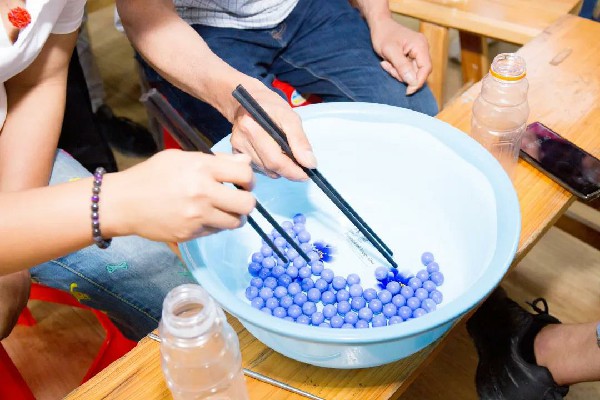 一盆晶瑩剔透的玻璃珠子,一雙滑溜溜的筷子,讓參加夾玻珠游戲的人小心翼翼卻又神情專注.。